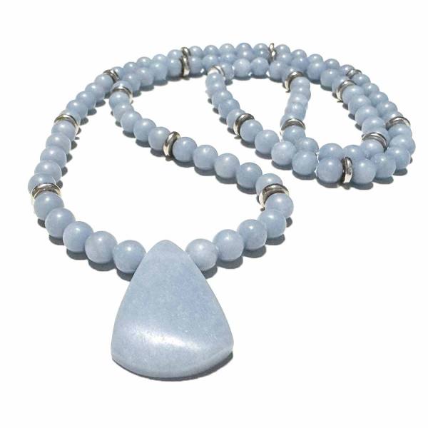 Angelit Anhydrit Edelstein Halskette blau mit Anhänger und versilberten Keramikbuttons,